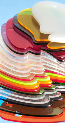 hochtransparent, wenig schlagzäh, UV-beständig, farblos, farbig, opal, gefrostete Oberflächen, grosses Sortiment an Farben und Dicken, häufig eingesetzt für Produktpräsentation und Dekorartikel.